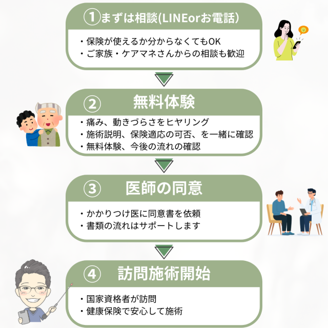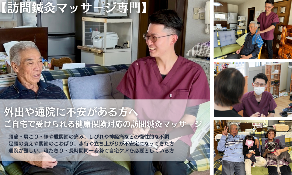 通院が難しい方のために、国家資格を持つ施術者がご自宅や施設へ直接訪問し、